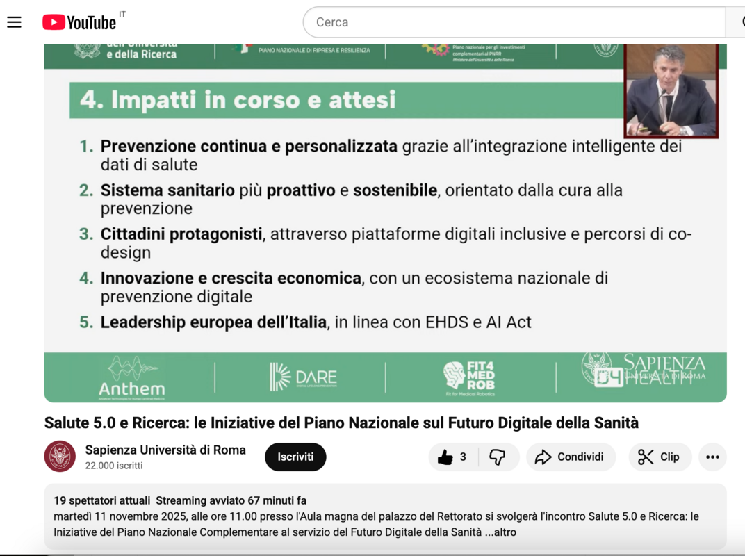 11 novembre 2025, vi aspettiamo all’evento “Salute 5.0 e Ricerca: le Iniziative del Piano Nazionale Complementare al servizio del Futuro Digitale della Sanità”, presso l’Aula Magna del Rettorato della Sapienza Università di Roma.