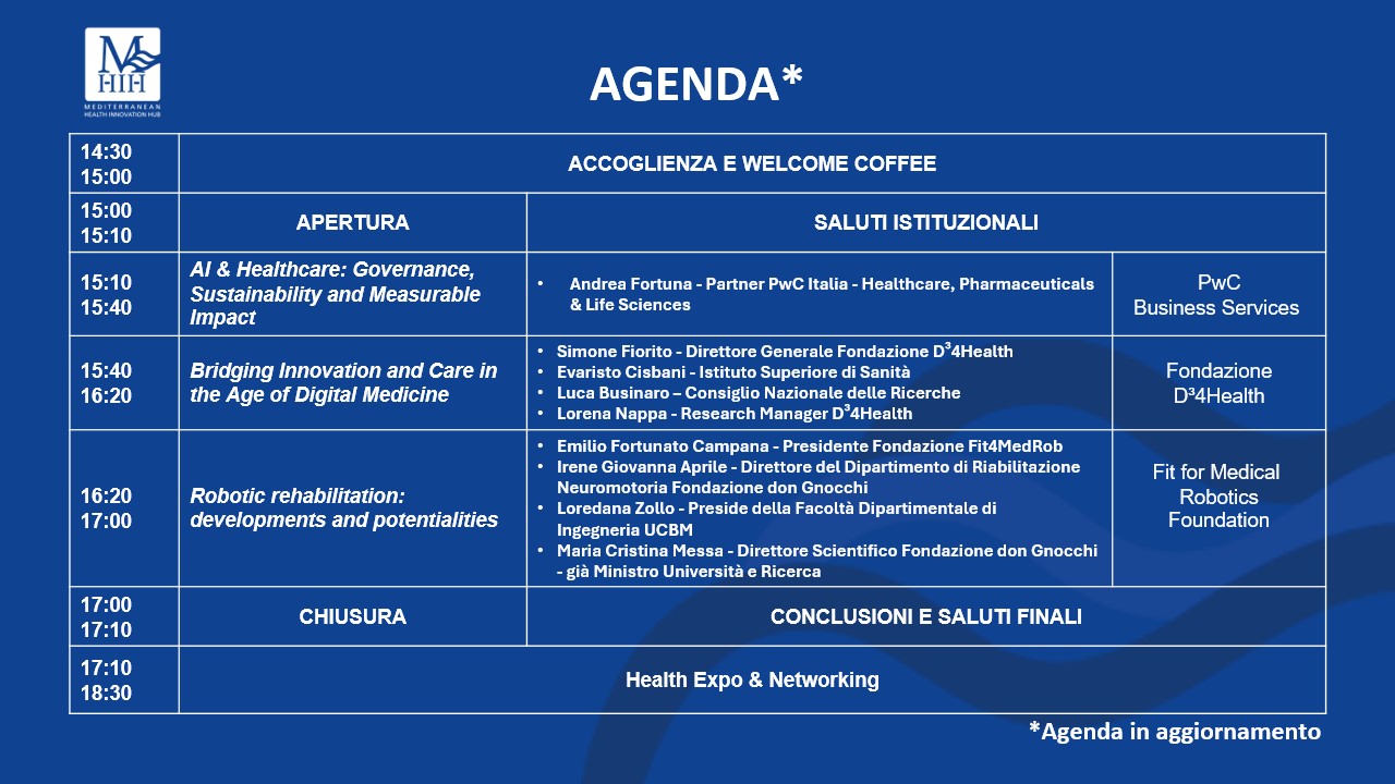 Durante l'Health Evolution Summit che si terrà il 15 ottobre 2025, nel pomeriggio, presso il Campus ELIS (Roma), sarà presente l'Iniziativa Fit4MedRob